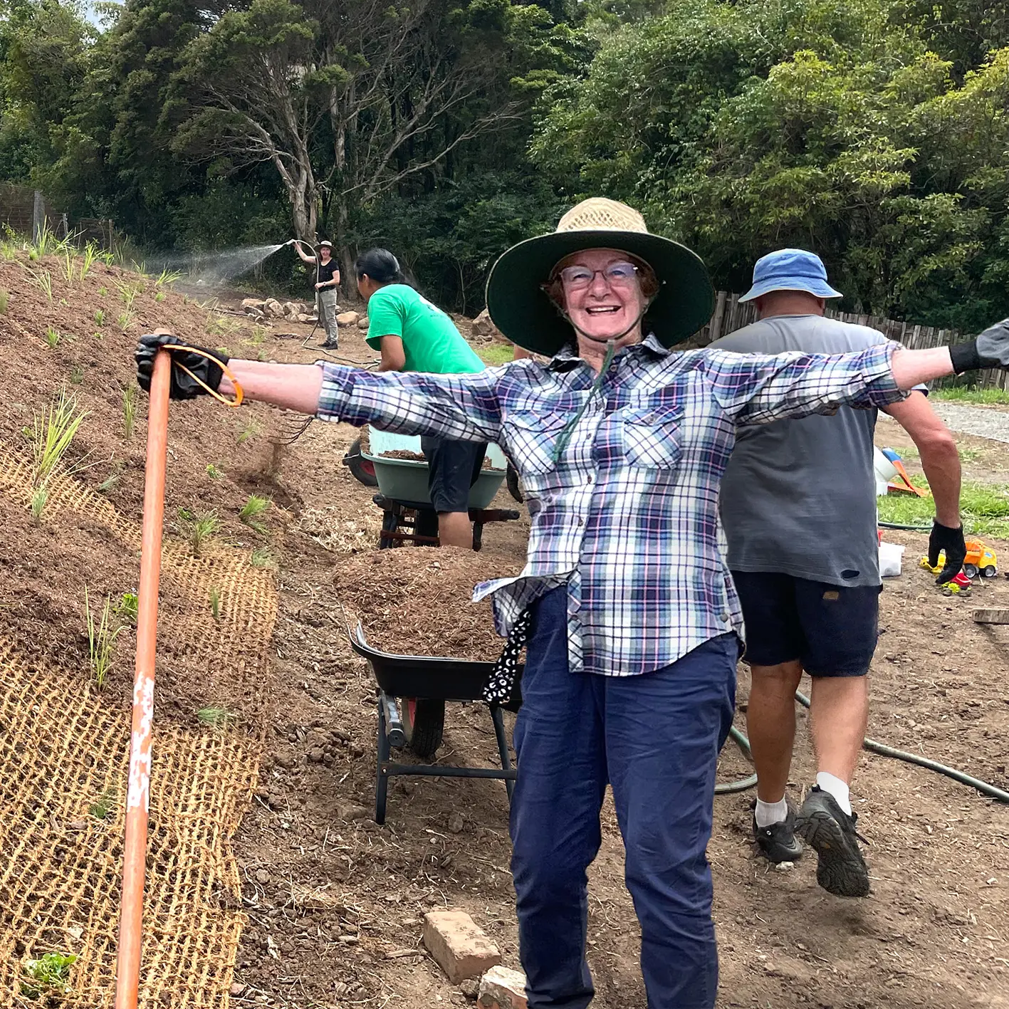 We’ll put on a simple catered lunch to fuel your work. Wear appropriate clothing: you’ll need sturdy, covered shoes, a hat, and sun-protective clothing that you’re happy to get dirty (preferably long pants and sleeves). We will provide gloves.