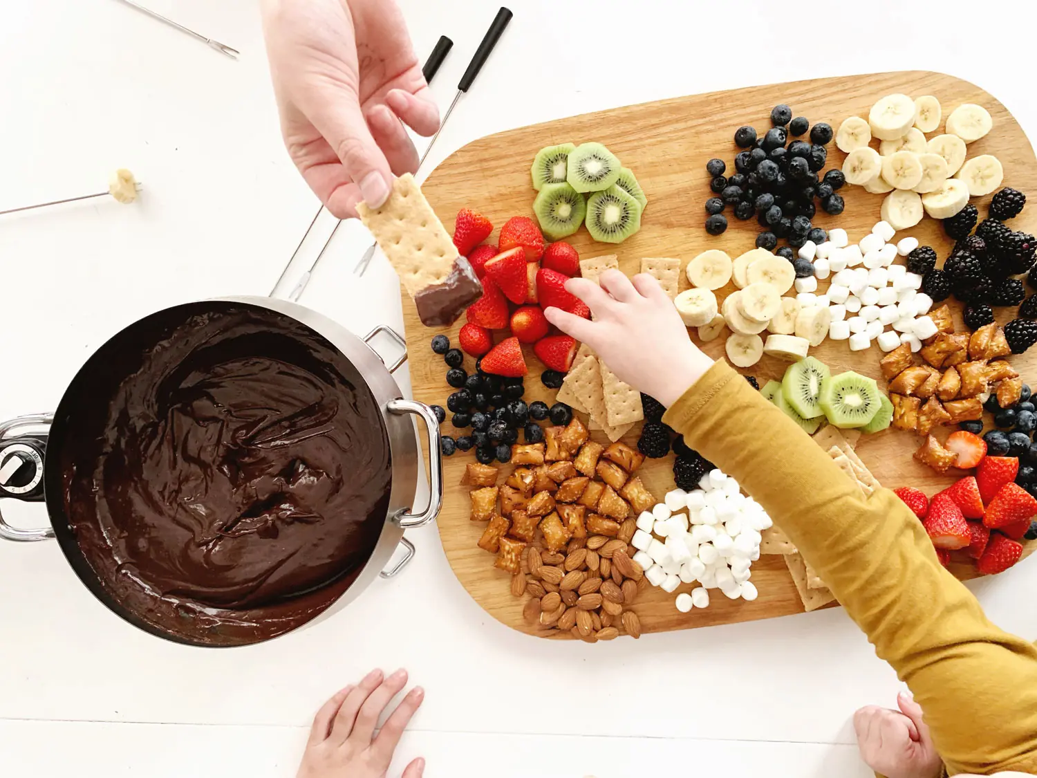 - Fruit salad (with yoghurt or chocolate fondue on the side if you want to be decadent – just melt some chocolate with a bit of milk or cream to keep it runny)